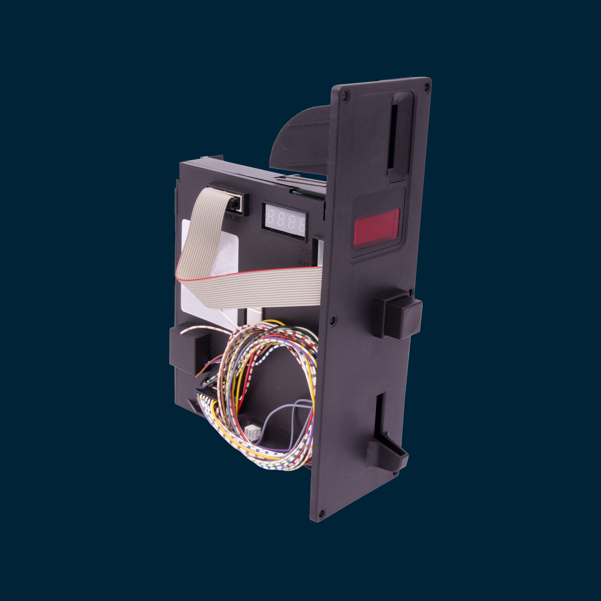 Elektronisk tokenacceptor bestående af: tokenacceptor, tilslutningskabel, kontrolkredsløb, tilslutningskabel og display.